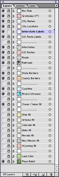 When you open one of the Illustrator files, you will be presented with a map featuring a coastlines, national, state and county borders, rivers, lakes, railroads, major and main highways, cities, names, graticules (lines of latitude and longitude). To get the full benefit from these files, make sure you have the "Layers" floating palette open by choosing "Show Layers" from the "Windows" menu. You will see from the Layers palette that not all layers are checked. By clicking at the left hand box of any other layer name a "eye" appears, and that layer becomes visible.