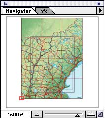 From the file menu, select "Place Relief" and Select a pre-colorized state relief map or the grayscale relief map from the state folder or directory, then click "Place". You can of course open a similar state map that you have customized for this purpose. The image will load and place itself behind all the visible vector material, however, it may not locate exactly to the vector map coordinates. Using the Select Tool (not the Direct Selection Tool), adjust the location of the background map until it appears directly in line with the outline box of the total state image. To finalize this step, it is essential to zoom in, as much as 1600 to 2400% on to the four corners of the map box to make sure the relief image is exactly in line. Whilst the relief image is the only selected and editable item, small adjustments are possible using the cursor up, down and side keys, or using the mouse, minor adjustments can be made so that, at high zoom, the relief image lines up exactly with the outer box. Check all four corners before locking the relief image layer. One helpful tip is make sure you have the Navigator palette open so that you move quickly from corner to corner of the work area