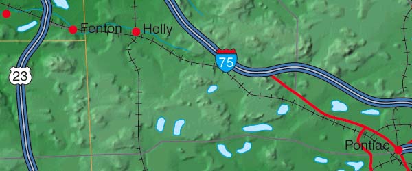 ![]() Detail View of the Cartographic style relief rendering when placed under the Vector EPS map. Any of the 5 relief styles may be used as alternative background textures to customize this map. Contrast of the relief map layer may be dimmed by adjusting the opacity - for Michigan is set to 100%. Select the Relief & EPS Map Package of Michigan option to download this style map collection. |