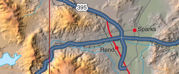 ![]() Detail View of the Cartographic style relief rendering when placed under the Vector EPS map. Any of the 5 relief styles may be used as alternative background textures to customize this map. Contrast of the relief map layer may be dimmed by adjusting the opacity - for Nevada is set to 70%. Select the Relief & EPS Map Package of Nevada option to download this style map collection. |