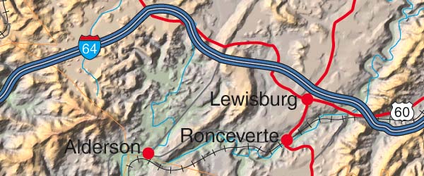 ![]() Detail View of the Cartographic style relief rendering when placed under the Vector EPS map. Any of the 5 relief styles may be used as alternative background textures to customize this map. Contrast of the relief map layer may be dimmed by adjusting the opacity - for West Virginia is set to 70%. Select the Relief & EPS Map Package of West Virginia option to download this style map collection. |